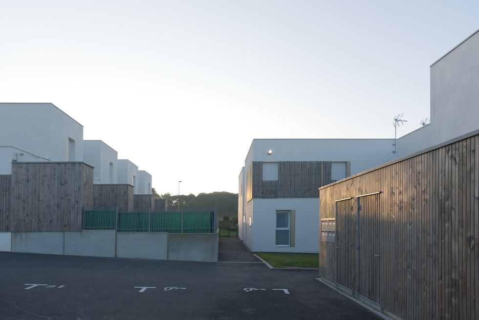 Le projet a pour objet la construction de 8 maisons individuelles groupées et de 16 logements collectifs intermédiaires superposés. Les maisons forment deux ensembles, créant un alignement structurant le long de la voie de desserte au RDC et plus dynamique à l’étage par une alternance de pleins et de vides. Les collectifs forment quatre ensembles de deux logements superposés reliés par un palier béton commun. Les volumes de deux logements superposés font penser à de grandes maisons et contribuent par ce biais à changer l’image préconçue du collectif en lui conférant une échelle plus humaine.