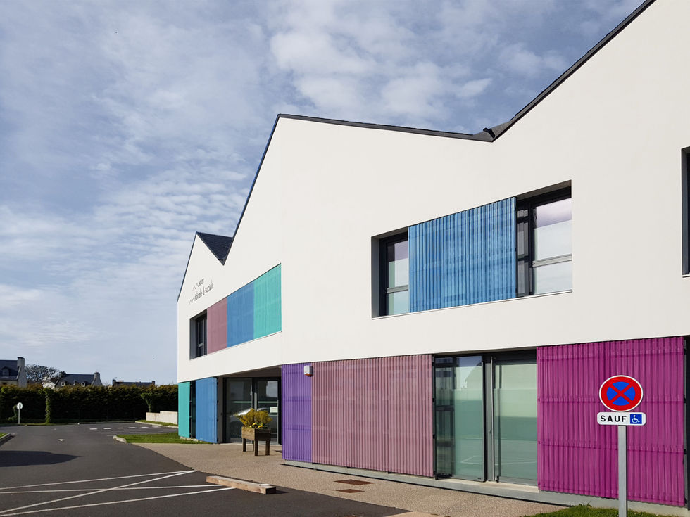 La maison médicale et sociale de Kerlouan permet de réunir des professionnels au cœur d’un volume simple et iconique, abrités derrière des « rideaux » perforés aux teintes douces marquant le caractère public du lieu.